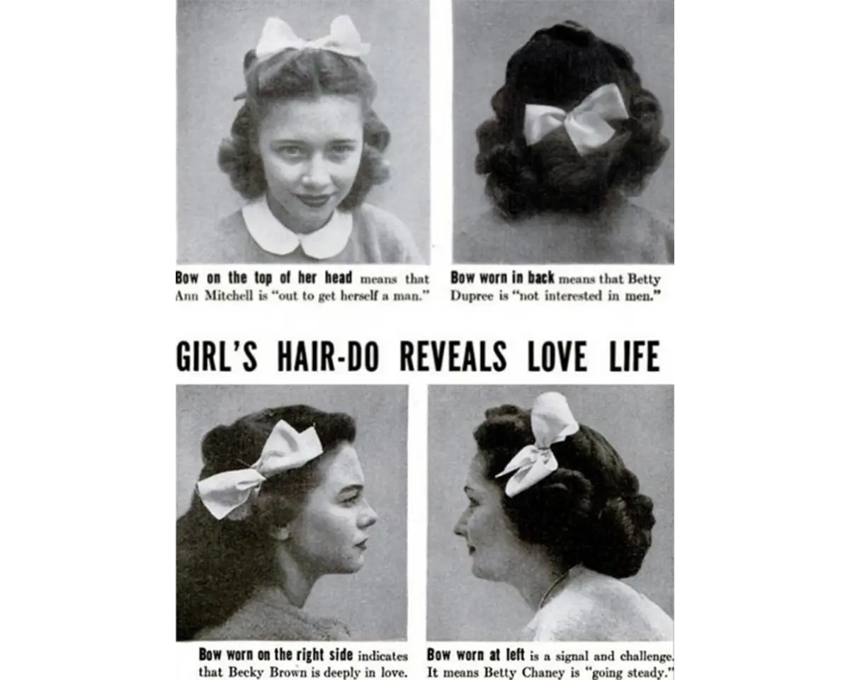 Even earlier, In 1944, an issue of LIFE Magazine not only depicted girls with ribbons in their hair, but analyzed the placement of the ribbon as an indicator of romantic availability and interest.